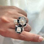 Make a bold statement with the Silver Black Enamel & Pearl Cocktail Ring, an exquisite piece designed to exude sophistication and modern elegance. This striking ring features a dazzling 1.70 ct Moissanite stone, celebrated for its unmatched brilliance and fire, paired with a lustrous 1 ct pearl that adds a touch of timeless charm.