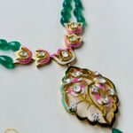 Embrace the beauty of tradition and artistic elegance with the Lotus Pink and Green Enameling Necklace. Handcrafted in silver with rich gold plating, this necklace showcases a captivating floral design brought to life with vibrant pink and green enamel work. It features a graceful blend of 2.50 mm round stones (1.05 cts) and radiant Polki diamonds (3.00 carats), adding old-world charm and luxury. With a gross weight of approximately 15–16 grams, this piece offers a bold yet graceful statement—perfect for festive wear, weddings, or heirloom-worthy gifting.