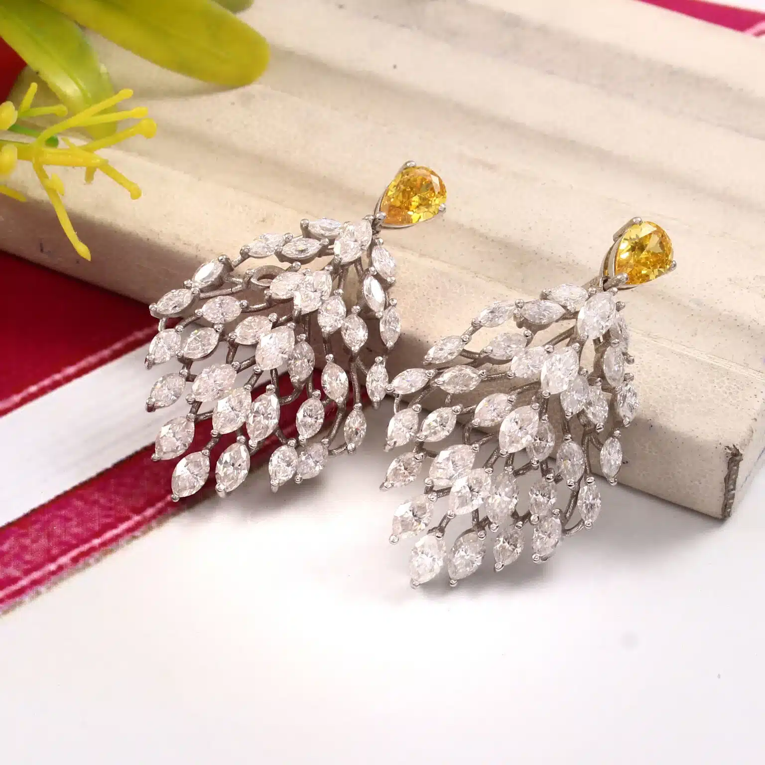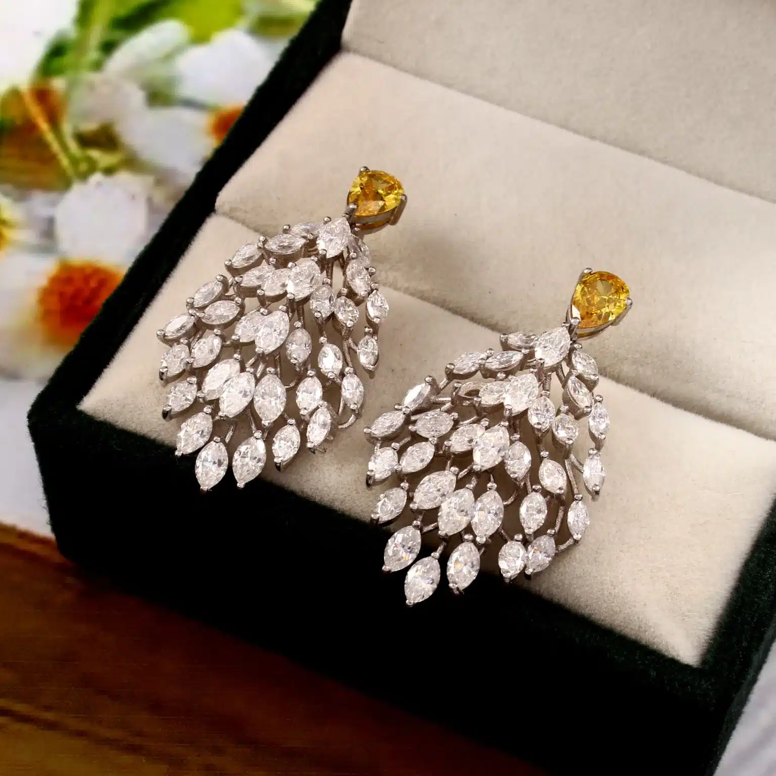 Elevate your style with the stunning Marquise Diamond Earrings, an exquisite statement of elegance and modern glamour. Expertly crafted in premium silver, these earrings feature dazzling 3×6 mm marquise-cut and pear cut moissanite stones totaling approximately 13.20 carats, offering exceptional brilliance and fire. Accentuating their bold design are vibrant 7×9 mm yellow pear-cut stones (approx. 3.00 ct), adding a striking pop of color and sophistication. With a gross weight of approximately 10.70 grams, these earrings are designed for standout moments while remaining comfortable enough for extended wear. Ideal for formal occasions or glamorous evenings out, this pair makes a luxurious and radiant addition to any fine jewelry collection