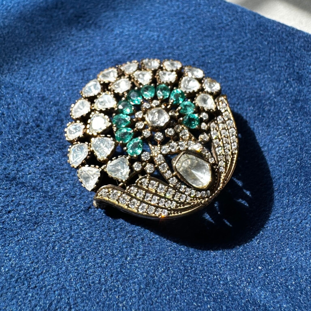 Crafted in premium 925 sterling silver, the design features intricate detailing that highlights the grandeur of the peacock motif. The body is adorned with shimmering polki-style stones, brilliant diamonds, and vibrant emerald-toned accents arranged in a radiant circular formation. Each stone is carefully set to enhance brilliance while maintaining a bold yet balanced aesthetic.